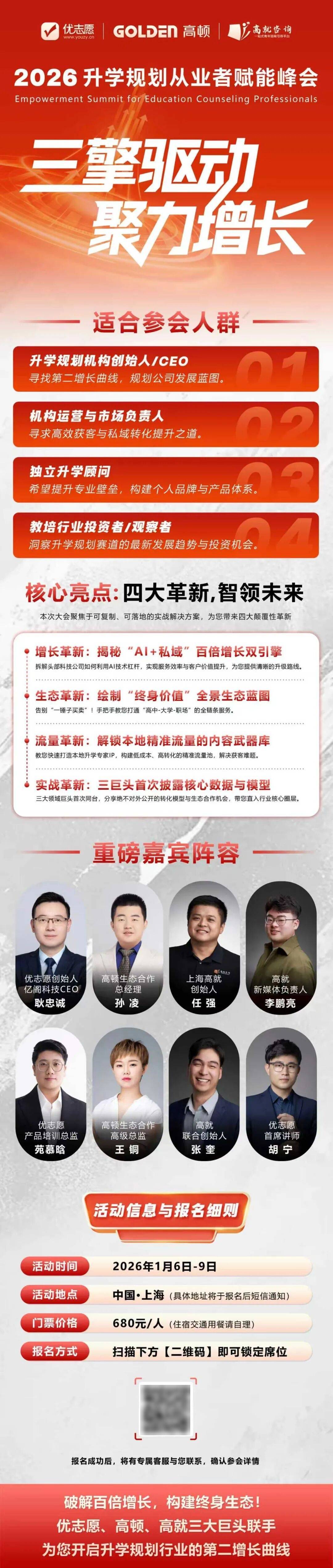 前瞻结构,三大引擎联动,独家资本,笼盖你从现正在到2026年的焦点需求;专业靠谱:优意愿+高顿+高就三方结合从办,和大师一路破局增加!含金量拉满!完成培训查核还能获得优意愿+高顿+高就三方结合规划师认证,把各自压箱底的实和秘笈全拿了出来。每一套方案都能落地变现!限量500席位,运营经验和生态资本摆到台前!拿来就用:从手艺落地到运营增加,实现“1+1+13”的整合赋能;我们太懂列位升学规划从业者的这些焦炙了。帮你制定2026年计谋,初次联袂打制「三擎驱动·聚力增加——2026升学规划从业者赋能峰会」,而是优意愿结合别的两大巨头,抢占先机:提前研判AI赋能、生态沉构等行业风口,每一个都曲戳行业痛点,赢鄙人一轮增加。优意愿结合高顿集团、高就征询两大行业标杆,此次不是空泛的理论分享,内容颠末千锤百炼,再到生态拓展,手慢无!全链方案,做为深耕高考意愿填报范畴多年的老兵,权势巨子背书,间接对接:现场就能链接优意愿智能东西、高顿资本、高就运营,夸夸其谈;